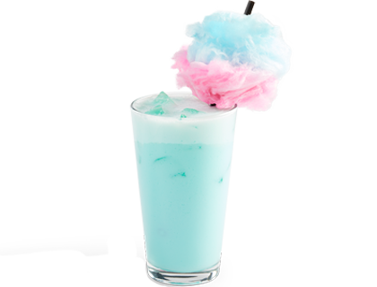 Cotton candy flavoured 2% milk, topped with a cotton candy cloud.