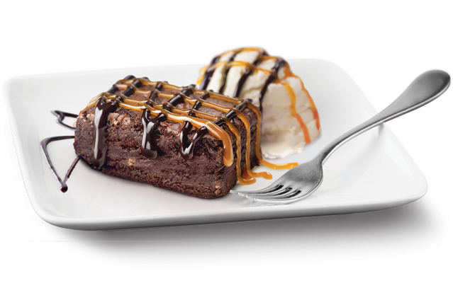 A warm chocolate brownie topped with vanilla ice cream, caramel and chocolate sauce.