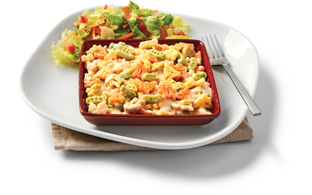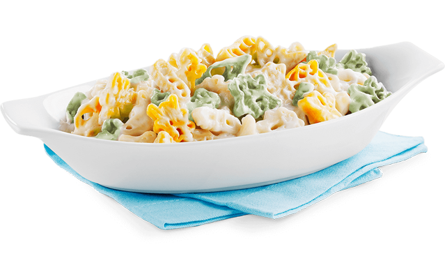 A 'big kids' portion of our colourful bug-shaped pasta, pizza mozzarella and Alfredo sauce.