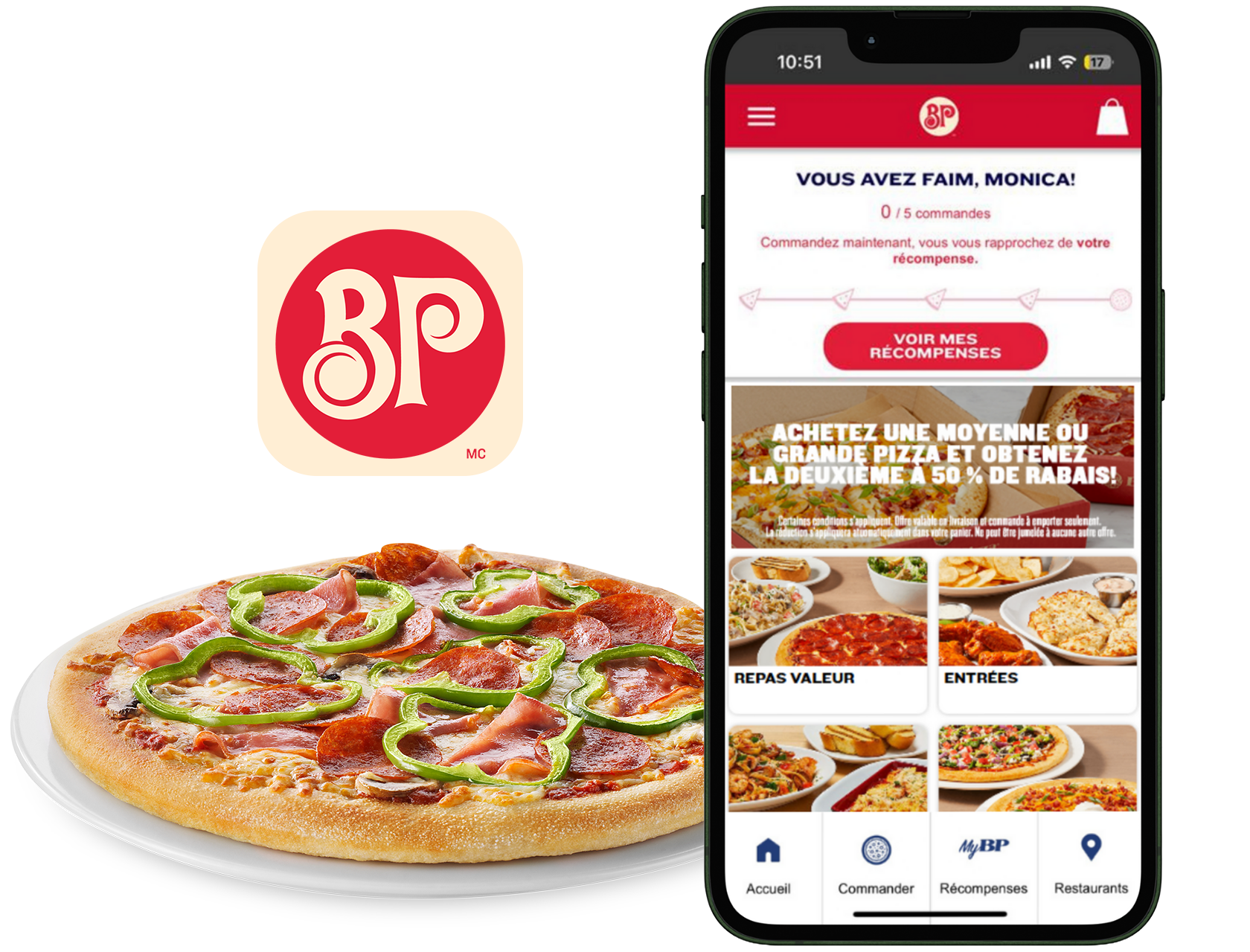 Vous avez bien lu! En tant que membre MonBP, chaque commande passée en ligne ou sur l’appli vous rapproche de votre délicieuse pizza offerte à 50 % de rabais après votre 5e commande en ligne. De plus, avec notre NOUVEAU suivi des commandes, il n’a jamais été aussi facile de visualiser votre progression pour obtenir votre récompense.